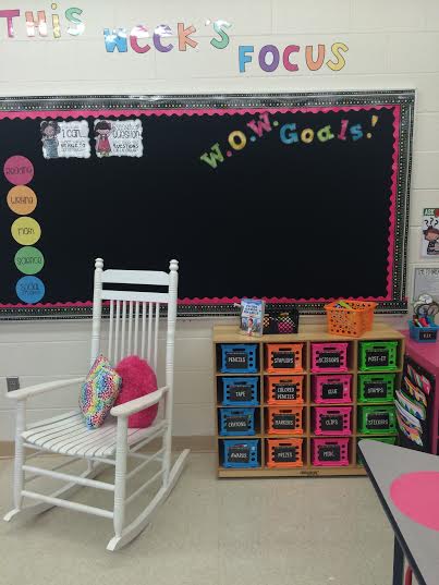 The front of my room! This is where I store my “I Can” statements for every subject! My district is HUGE on that! I also do the essential question! This set comes from Amy, her stuff is to die for! Every week the students will write a within one week goal on a post it and put it on the board to refer back to! Below the board is where I house all extra supplies! Aren’t those dollar bins from Walmart the cutest????