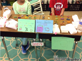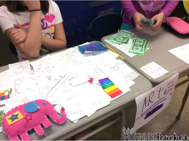 On the final market day, they set up their businesses and got prepared to sell! We were selling to other third graders in the school! So, we all switched classrooms and walked around buying each others product! (every kid got $20 to buy from other kiddos) You could easily do this with parents too! Selling things to their parents would make them look at a different type of customer!