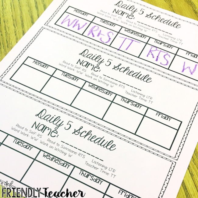 The last thing I keep in my daily 5 binder is for my students. On Monday, I have students fill out these sheets so they know where they go all week. I find if they just fill it out on Monday the rest of the week goes much smoother! (I have group sheets for if you do 3 or 5 rotations a day, as well)